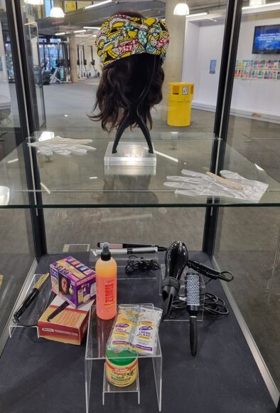 Within the exhibition you can see straightening and natural hair care products, head wraps, barber tools, and more. These objects help us to share important stories and evoke conversation whether that be about: